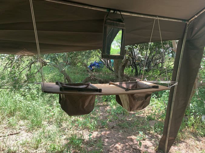 Solar camp light in tent and bathroom and small mirror, small table and washbasin in bathroom.