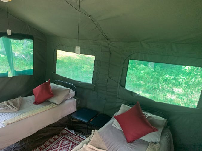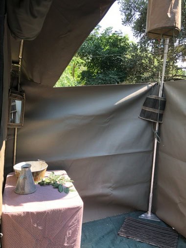 Mini Meru tents are en-suite with rear door access to bathroom area with bush showers and toilet.