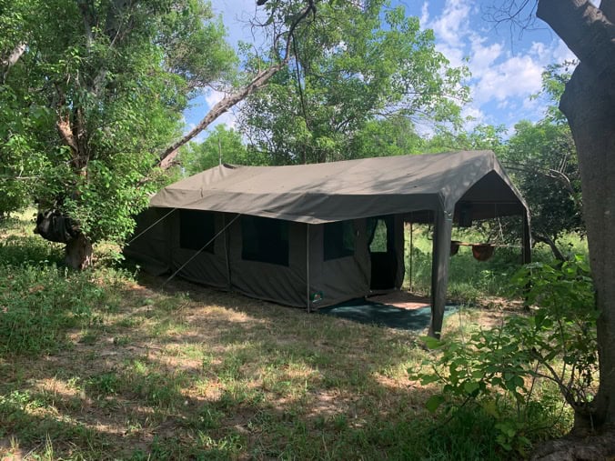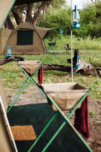Spacious 3m x 3m Explorer tents 2 insect-proof windows; small front veranda awning area with safari chairs.